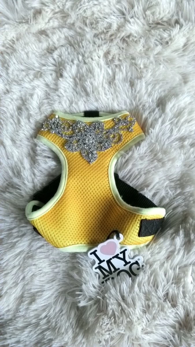 Fijn hondenharnas van meshstof.Het heeft een prachtige glitterapplicatie van kleine strasssteentjes op de borst.Het harnas sluit met een clipsluiting.Meet de borstomvang van je hond en kiesje maat uit de maattabel. (zie foto)Wasbaar op 30 graden.